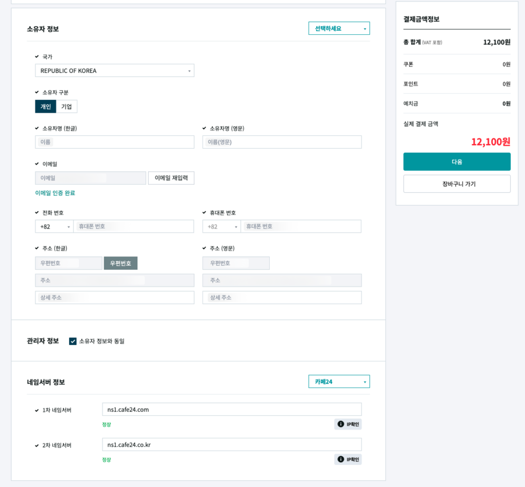 - 장바구니 상단 도메인 개인정보보호 서비스 신청 체크박스를 선택해 주세요.